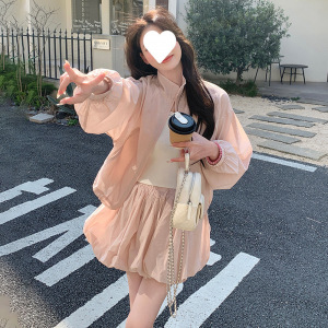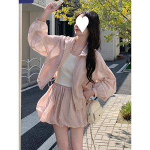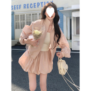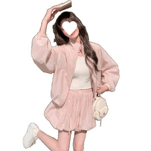 女性用ピンクのショートトップとバドスカートスーツ、夏の甘い服装、日焼け止め服とスカートの2点セットの完全なセット