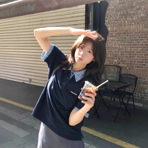 韓国レトロフェイクツーピースショルダー半袖Tシャツレディースパッチワークチェック柄ポロシャツ夏ルーズカレッジスタイルトップ