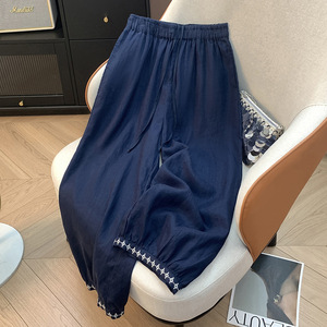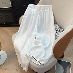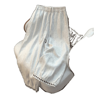 実物写真夏の新しいレトロリネン刺繍ブルマ女性のレースアップ弾性ウエストルーズカジュアルパンツワイドレッグパンツ