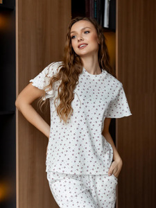 2025 越境ヨーロッパとアメリカの女性のためのパジャマ春と秋の甘い愛のプリントフリル半袖ズボンホームウェアセット