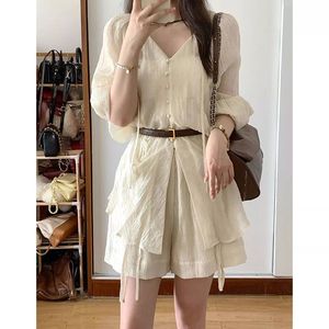 夏のファッションスーツ 2025 新しい女性の襟レースアップシャツトップ + ワイドレッグルーズショーツ 2 点セット