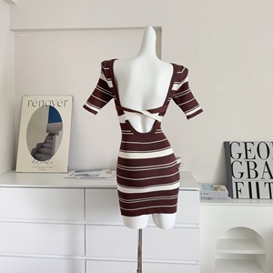 クロスバックレスストライプスリムフィットウエストドレス2025年夏新作腕包みショートスカート