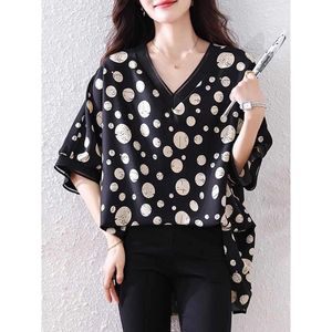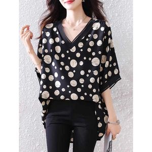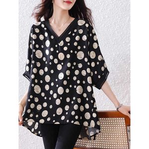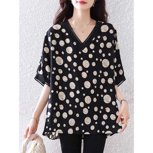 デザイン気質シフォンシャツ2025夏新作大きいサイズお腹カバーと年齢軽減レディース七分袖Tシャツトップス