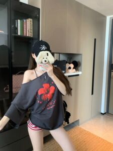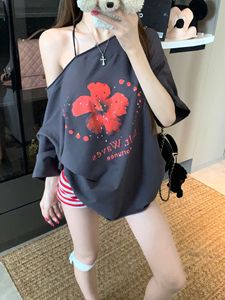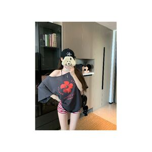 ファッションスーツレトロフラワー斜め肩ルーズカジュアル半袖 Tシャツ女性の夏の赤いストライプショーツ 2 点セット