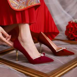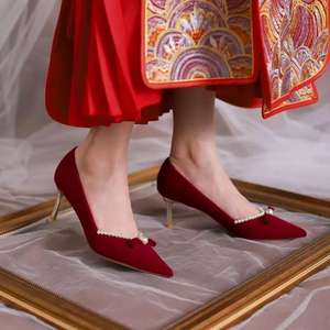 ウェディングシューズ Xiuhe ウェディングドレスツーウェア 2025 春と秋の新しいブライダルシューズ薄いヒールの靴女性のパールレッドハイヒール