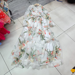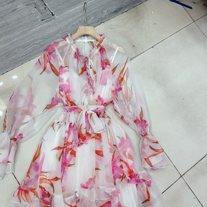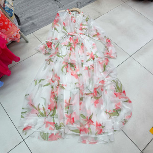 13ラインフレンチレトロプリントシフォンルーズロングスカートシングルブレストドレスサスペンダーベルト付きC2 # 2518