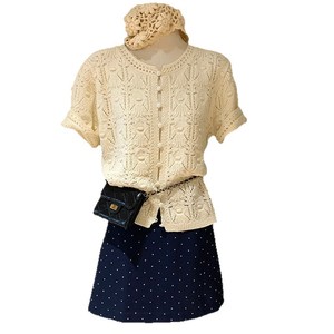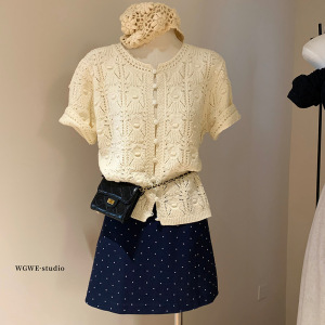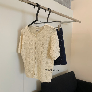 WGWE6088法式复古短袖上衣钩花镂空纽扣圆领针织开衫