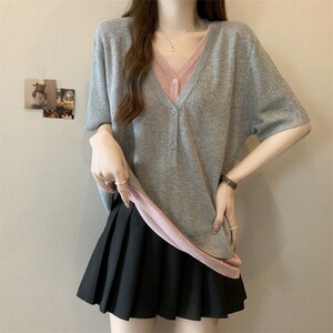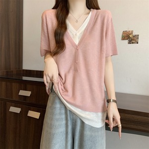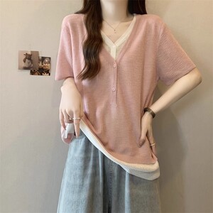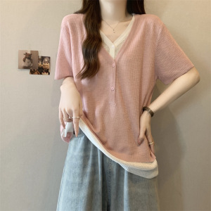 偽ツーピースピンク V ネックニットアイスシルク半袖 T シャツ女性の夏の新しい大きいサイズファット mm ゆったりお腹カバーシックなトップ