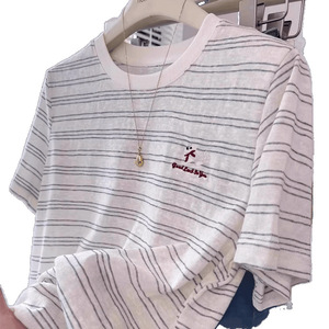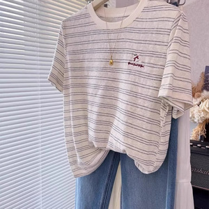韓国風コントラストストライプウサギ刺繍ニット半袖Tシャツレディース夏ラウンドネック右肩ルーズスリムトップ薄手