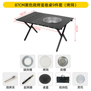 87cm ブラックバーベキューエッグロールテーブル 10点セット(メッシュグリルパン)