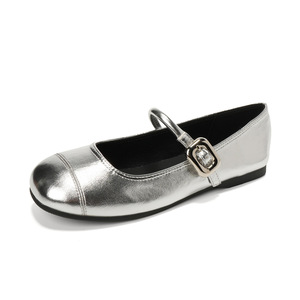 フレンチスタイルのワンストラップ浅口フェアリースタイルシルバーの小さめ革靴、ラウンドトゥ、フラット、ソフトソール、メリージェーンシューズ(女性用)