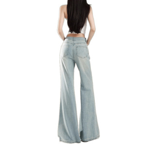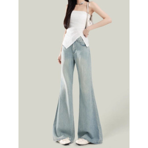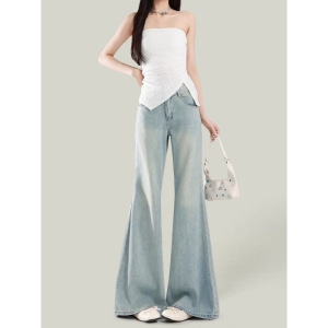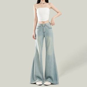 大きいサイズのデザイン、脚にフィットしないハイウエストマイクロフレアジーンズ、女性用夏用薄手ライトブルールーズドレープ馬蹄パンツ