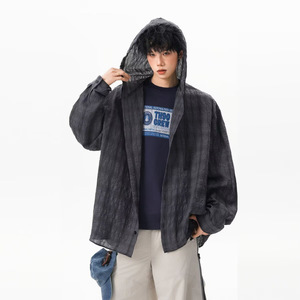 春のアメリカンレトロカジュアルチェック柄長袖シャツ、男性と女性用、トレンディなブランドルーズシャツ、フード付き日焼け止めジャケット