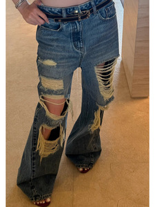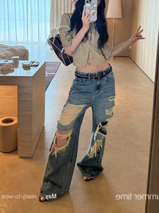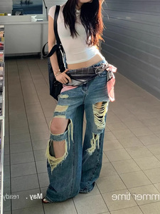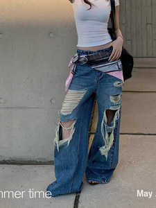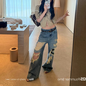 SUN11 不規則なリッピングルーズジーンズ女性の夏アメリカンローウエストストレートレッグレイジーカジュアルパンツ