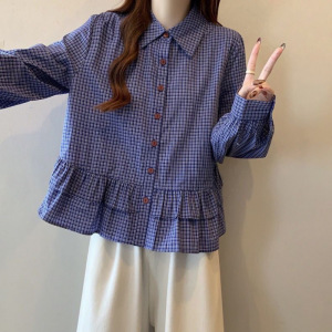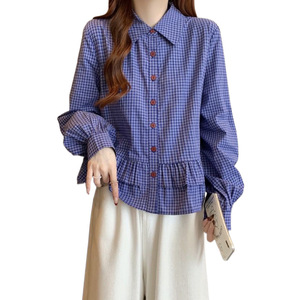 ブルーチェック柄シャツレディース2025初春新作ゆったりスリムスイートベビードールシャツフリル裾トップ