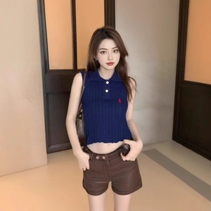 フランスのユニークでシックな刺繍入りポロカラーニットベスト女性用夏スリムショートノースリーブスイートホットガールトップ