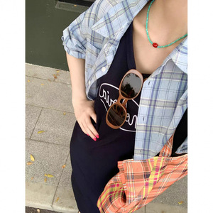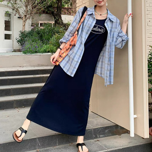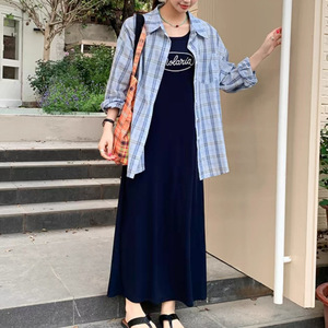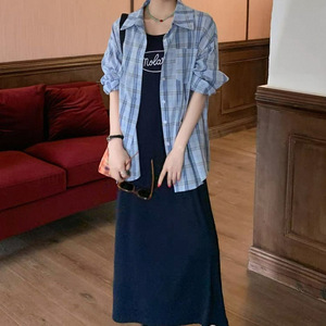 ベストドレスブルーチェック柄シャツツーピースセット女性のための 2025 春の新韓国カジュアルファッションスーツ