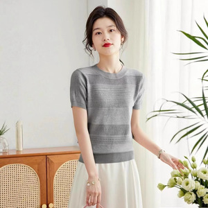 2025 新しい夏の女性の半袖 Tシャツ中空アイスシルク薄い右肩気質年齢軽減ルーズファッションセーター