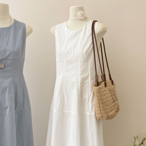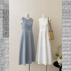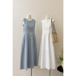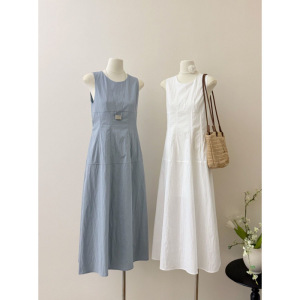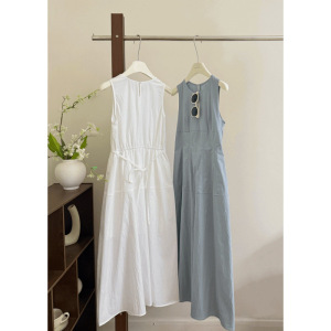 ミニマリストスタイルカジュアルブルーノースリーブベストドレスレディース夏フレンチスタイルウエストシンプルロングスカート多用途