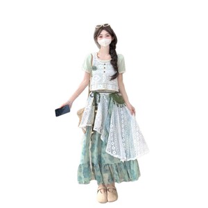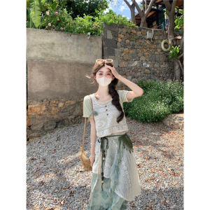 2025夏の森風スリーピーススカート半袖Tシャツ+中空ベスト+ウエストチェーンバッグフラワー