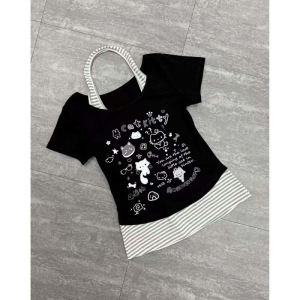 かわいいデザインニッチストライプホルターネックかわいい猫半袖Tシャツレディース夏ホームスタイルスリムフィットショートトップ