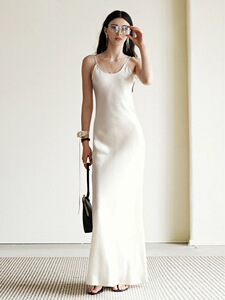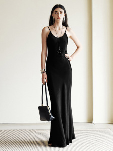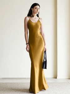 100% プリーツ輸入アセテートサテンビッグバイアスカットカバー肉バージョンフレンチサスペンダードレス女性用