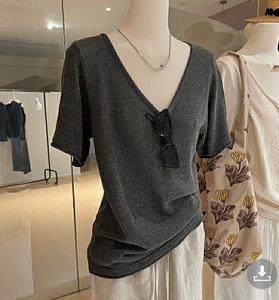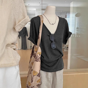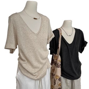 リネンニットTシャツレディース夏半袖Vネックゆったりカジュアルリラックスオールドマネースタイルシンプル右肩ハイエンドトップ