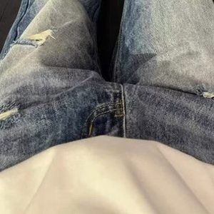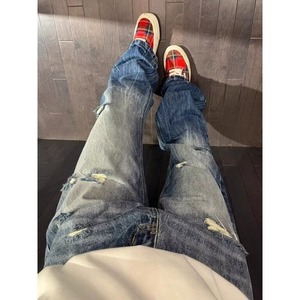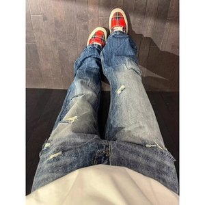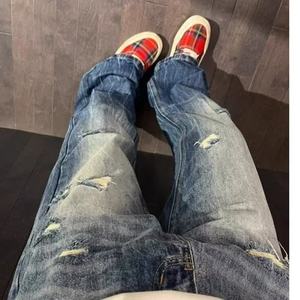 アメリカンライトニングパターンリップドジーンズメンズ2025初夏着用新作ストレートパンツシミターマイクロフレアパンツ