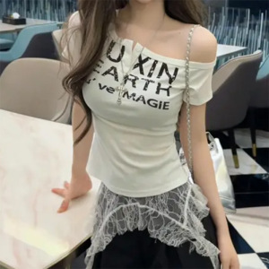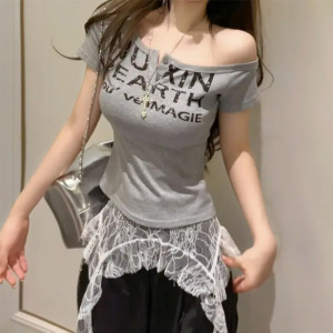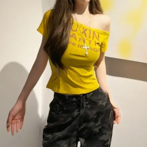 2025 夏の新アメリカンホットガールオフショルダー半袖 Tシャツ女性のスリムフィットオフショルダーショートトップ