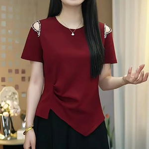 純綿大きいサイズヨーロッパビーズオフショルダー半袖 Tシャツ女性のための 2025 夏の新しいルーズ痩身ファッショナブルなトップス女性のための