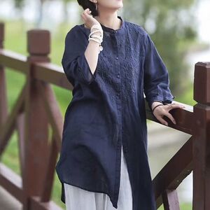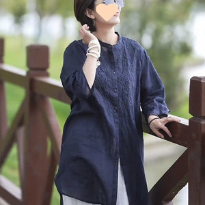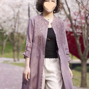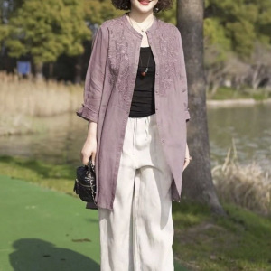 2025 春夏レトロ刺繍綿とリネンシャツスタンドカラーミッドレングス気質高貴なマザーズウェアカジュアルジャケット女性のための