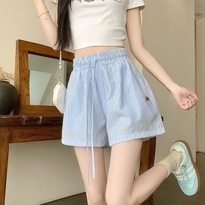 縦ストライプ巾着レター刺繍ワイドレッグショーツレディースルーズサマーホットパンツカジュアルレディースパンツ直接配送