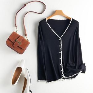 Ejia 同スタイル 100 マルベリーシルク V ネック木耳小レース黒長袖シャツ女性の夏の新しい薄いトップ