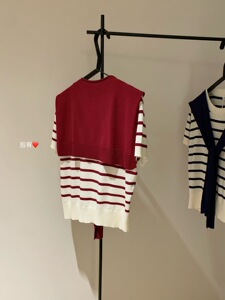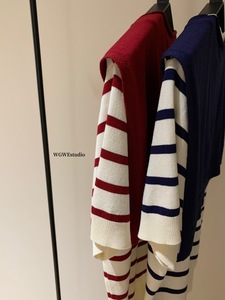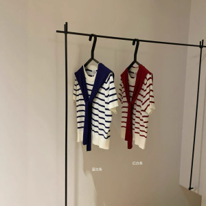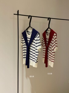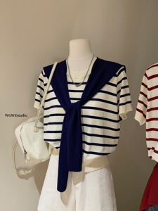 【WGWE】6006 新しいネイビースタイルショールカラーラウンドネック半袖ストライプセーターレディースファッショントップス