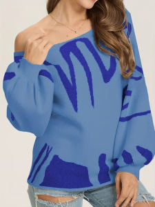 クロスボーダー 2025 新しい秋と冬のボートネック不規則なコントラストパターンバットスリーブルーズカジュアルプルオーバーセーター女性用