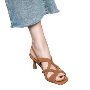 女性用ソフトレザースクエアトゥオープントゥサンダル、クロス中空夏用ブラウンハイヒール、女性用スティレットヒール