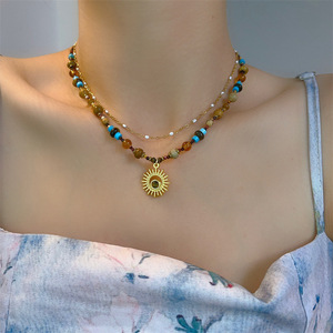 チタン鋼天然石サンペンダントネックレスクロスボーダーメイラード気質鎖骨チェーンエスニックスタイルスタッキングアクセサリー