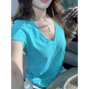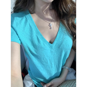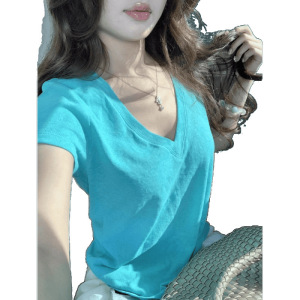 韓国多用途ニッチピュアブルー右肩Vネック半袖Tシャツレディース2025年夏新作ローネックスリムトップ