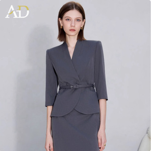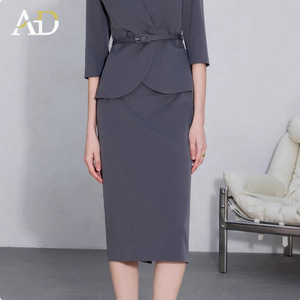 春夏の高級グレー七分袖プロフェッショナルレディーススカートスーツVネックファッションヒップカバーロングマネージャーフォーマルスーツスカート