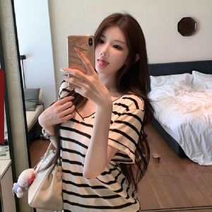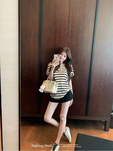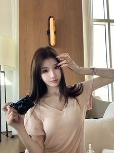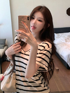 コントラストストライプ V ネック半袖スリム T シャツ女性のための夏 2025 新しいスリムホットガールニッチシックな多用途トップ