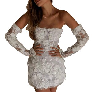 白いショートライトウェディングドレスブライダルウェディング婚約ドレスフェミニンな長袖ドレス宴会ハイエンド