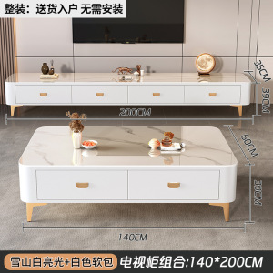 コーヒーテーブルとテレビキャビネットの組み合わせ雪山白岩板+白キャビネットゴールド飛行機脚140+200