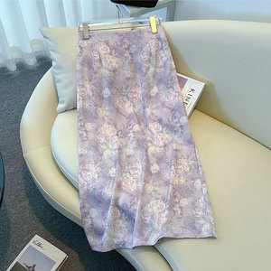 エレガントなサテンプリントスカート女性の夏の新しい半弾性スリットファッション花柄ストレートスカート