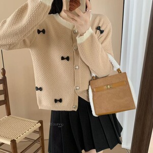 韓国の春と秋の新しいスタイルの優しいスタイルの対照的な色の立体的なリボンの柔らかいワックスのようなセーター女性用甘いショートニットカーディガン