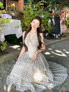 フレンチスタイルのウエストピンチファッションスカートVネックホルターネックケーキミドル丈スカート夏の海辺の休暇水玉模様のドレス