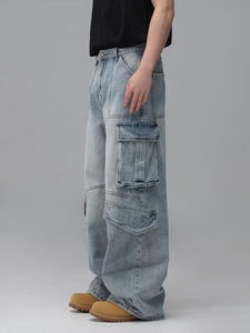 トレンディなアメリカンスタイルのウォッシュドマルチポケットステッチデザインワークジーンズ、男性と女性用、ストリート多用途ストレートパンツ