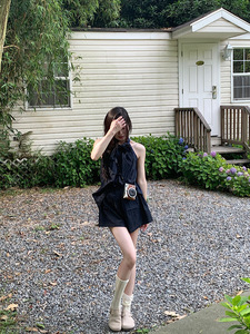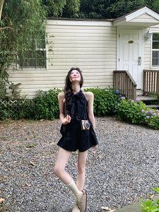 レトロリボンデニムホルターベスト女性の夏の香港スタイルのファッションスーツカジュアルワイドレッグショーツ 2 点セット