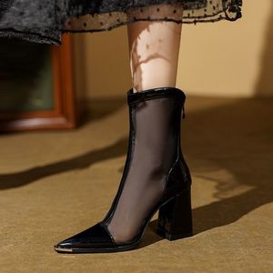 メッシュブーツ、スリムブーツ、パテントレザー、ポインテッドトゥ、太いヒール、メッシュサンダル、レディース夏薄型中空白ショートブーツ、セクシーハイヒール
