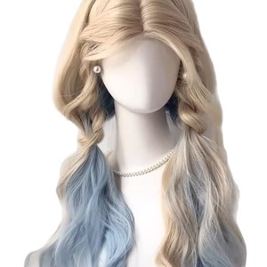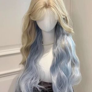 フェイクヘア女性チーズシーソルトプラチナグラデーションブルーリアルなナチュラルフルヘッドバンドスタイルビッグウェーブロングカーリーウィッグセット