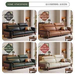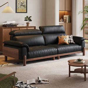 艾沃适 意式极简沙发黑色复古风客厅三人位胡桃木色头层牛皮沙发